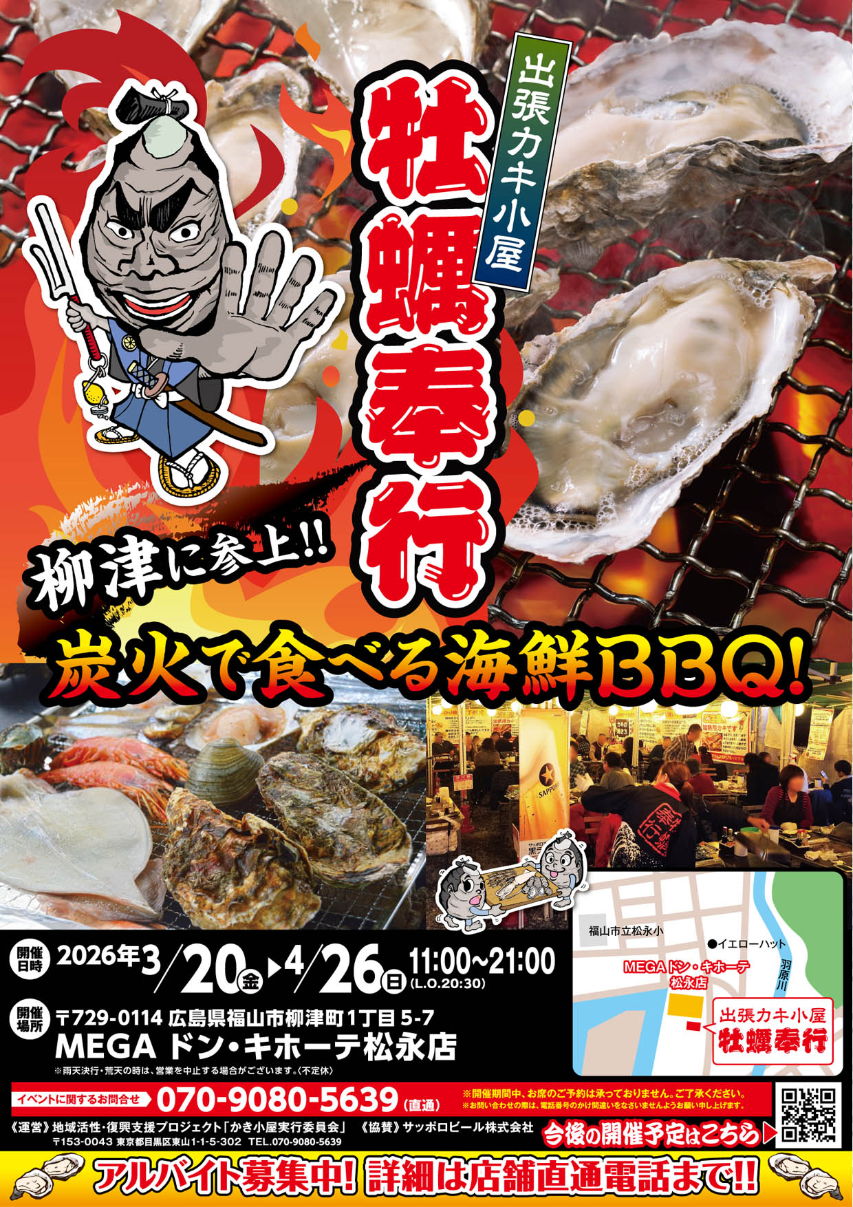 | 現場名 | 出張カキ小屋「牡蠣奉行」in MEGAドン・キホーテ松永店 |